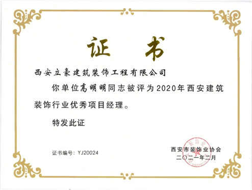 我公司資深項(xiàng)目經(jīng)理桂志平、高明明、張麥龍被評(píng)為2020年西安建筑裝飾行業(yè)優(yōu)秀項(xiàng)目經(jīng)理。